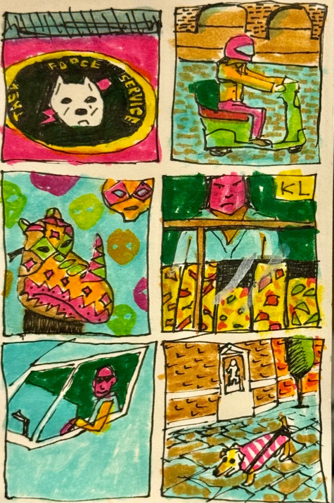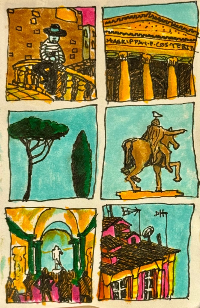 It’s not in any real order, the annoyed pizza lady is next to the rhino mask. The fascist looking Task Force Service lightning dog was on a car hood we passed while leaving Rome. The other dog was wandering around Venice without a leash. The little statue next to the antennae strewn roof is David in Florence. We packed a lot into 6 days. In Rome we missed Gladiator 2 by a week, it would have been so cool to see it in Italian down the street from the Colosseum.